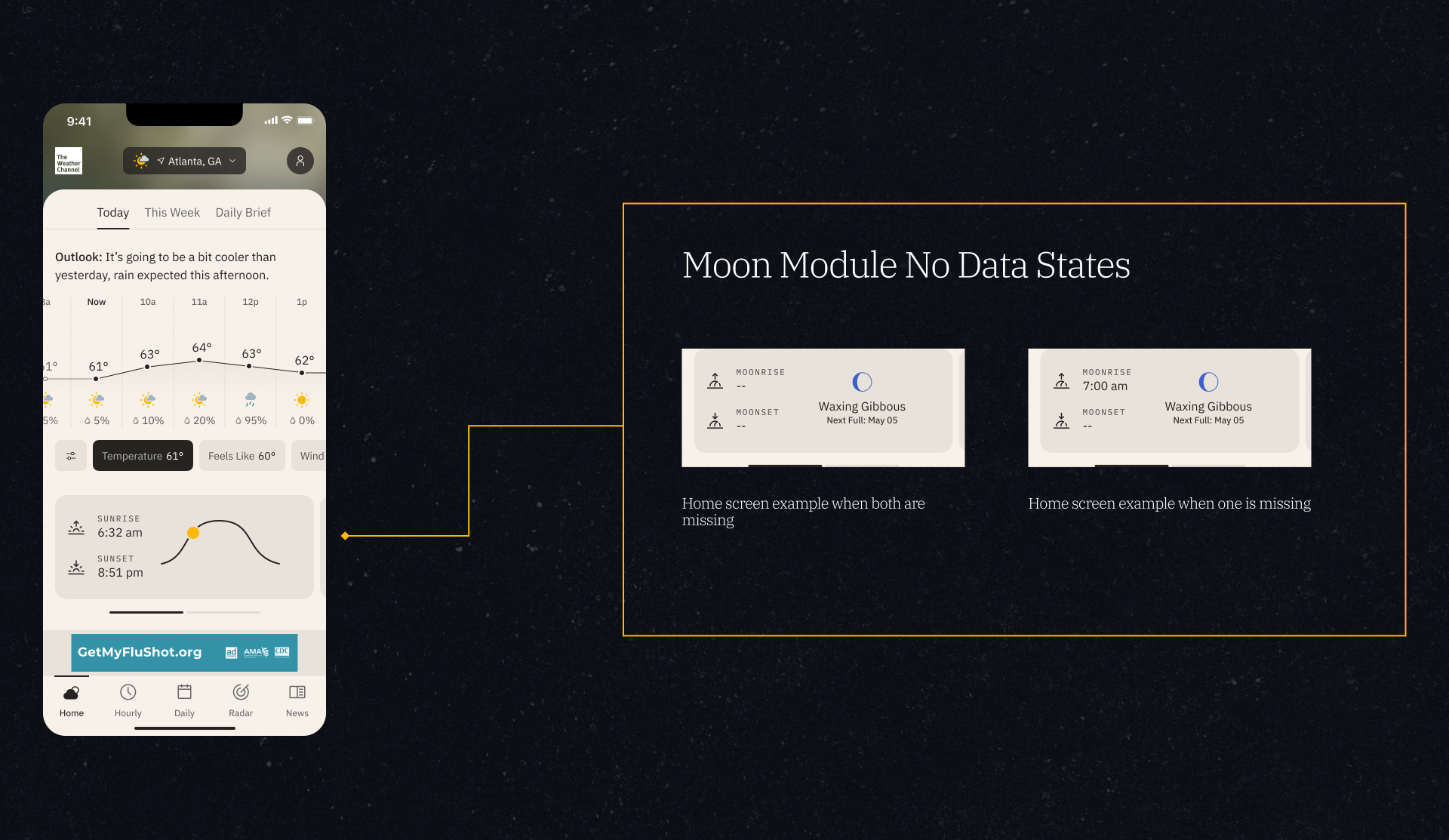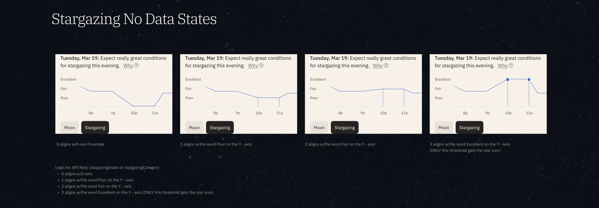 Weather and astronomical data is often incomplete — gaps in coverage, seasonal unavailability, location-specific quirks. Rather than showing blank modules or generic error messages, I designed fallback states with educational placeholders that still provided value. No dead ends, no broken trust.