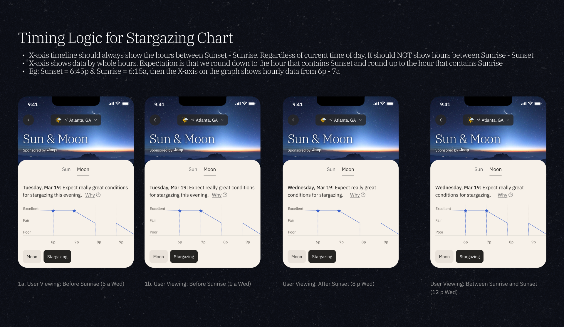 That meant balancing multiple things at once: improving comprehension of sun and moon data, surfacing the connection between lunar cycles and tides, supporting stargazing and night-sky planning use cases, creating reusable explainer patterns, designing resilient states for missing or partial data, and fitting everything within an established design system at consumer scale.