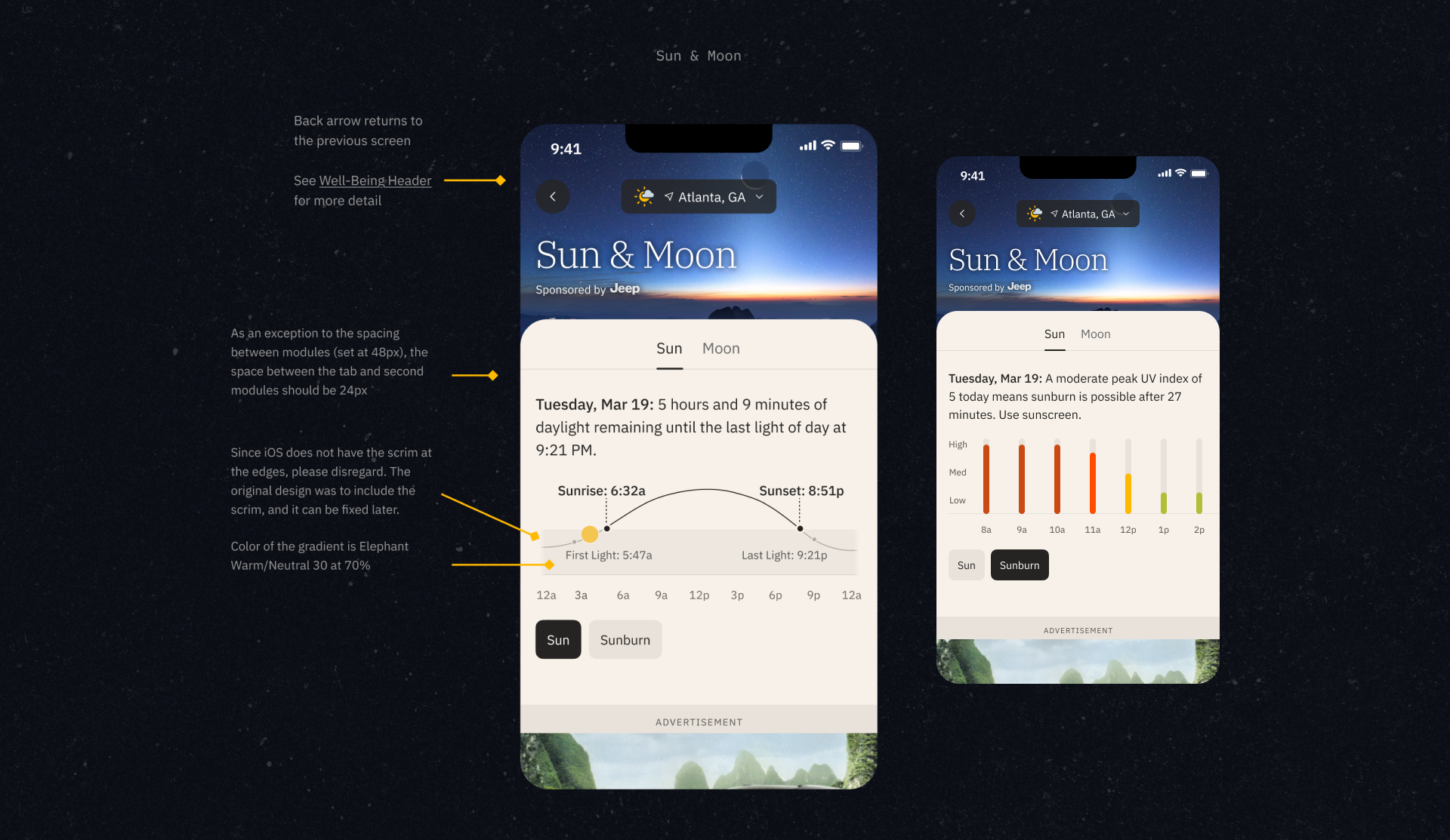 The redesigned Sun & Moon experience shipped across The Weather Channel's web, iOS, and Android platforms — reaching hundreds of millions of users.