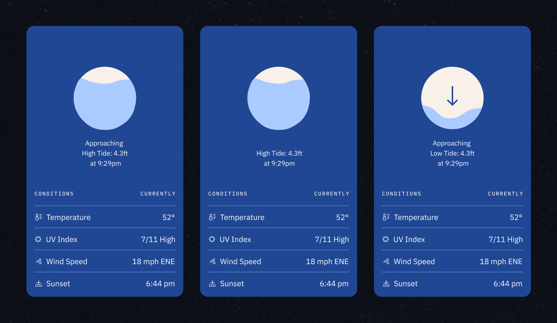 Tides are directly influenced by the moon's gravitational pull, making them a natural extension of the Sun & Moon experience — not a separate feature. Rather than treating tides as an isolated module, I designed them as part of a connected astronomical system. Simple visual cues for high and low tides, clear timing for planning activities, and accessible language replaced overly technical oceanographic terms. This was especially relevant for coastal users who rely on tide timing for recreation, fishing, or boating. By integrating tides into the broader system, the experience became more holistic and educational.