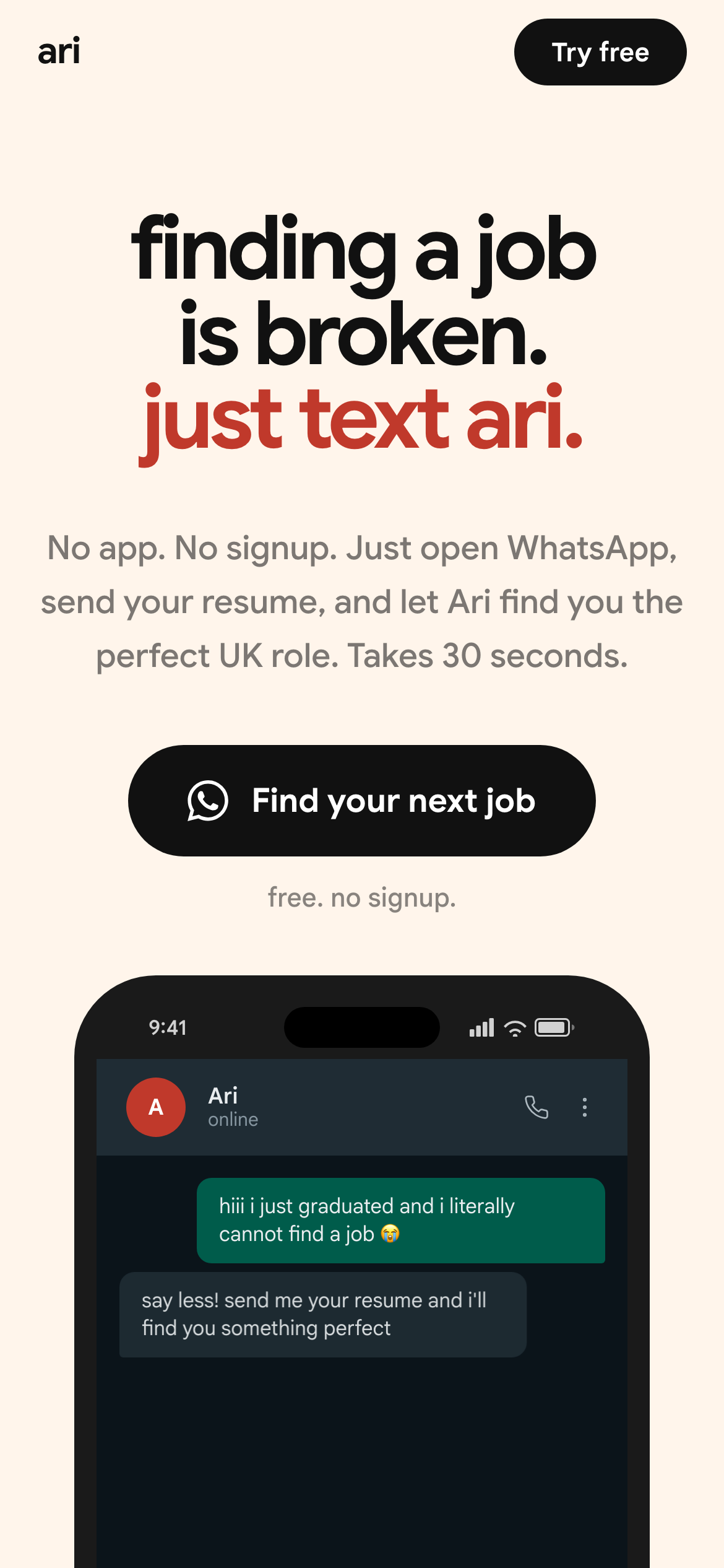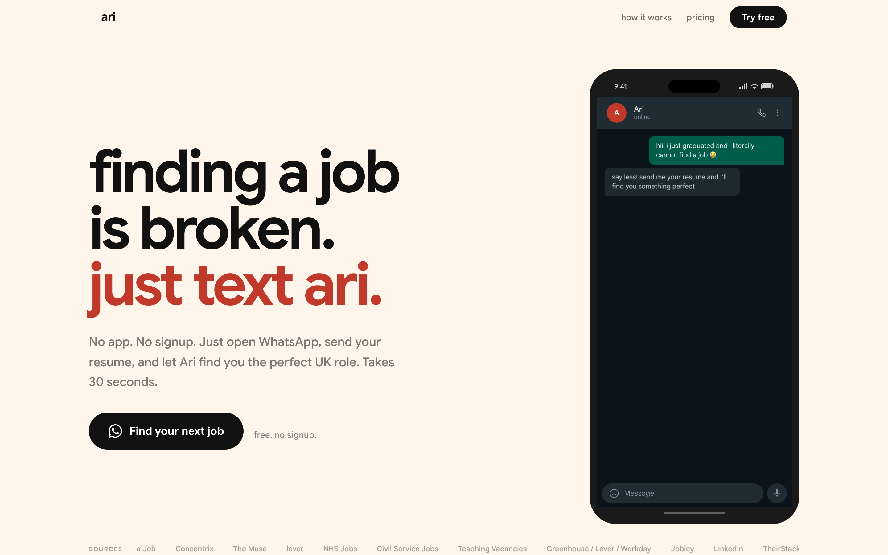 Text Ari is an AI career assistant I built that scrapes seven UK job boards, matches candidates with hybrid vector search and LLM reranking, and delivers everything through WhatsApp. No app to install, no profile to fill out beyond a CV, no logging into another website. Send a message, get matched jobs.